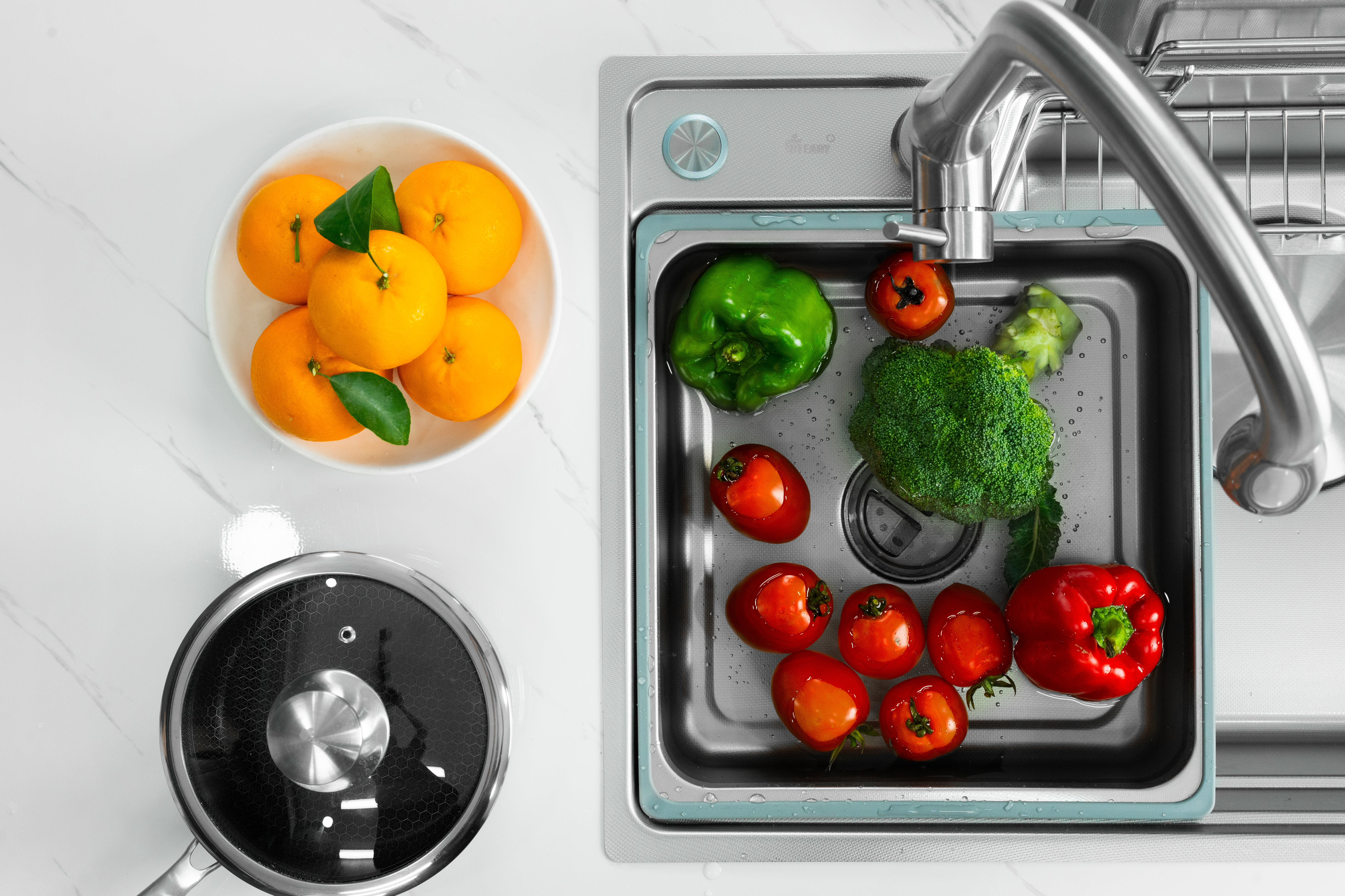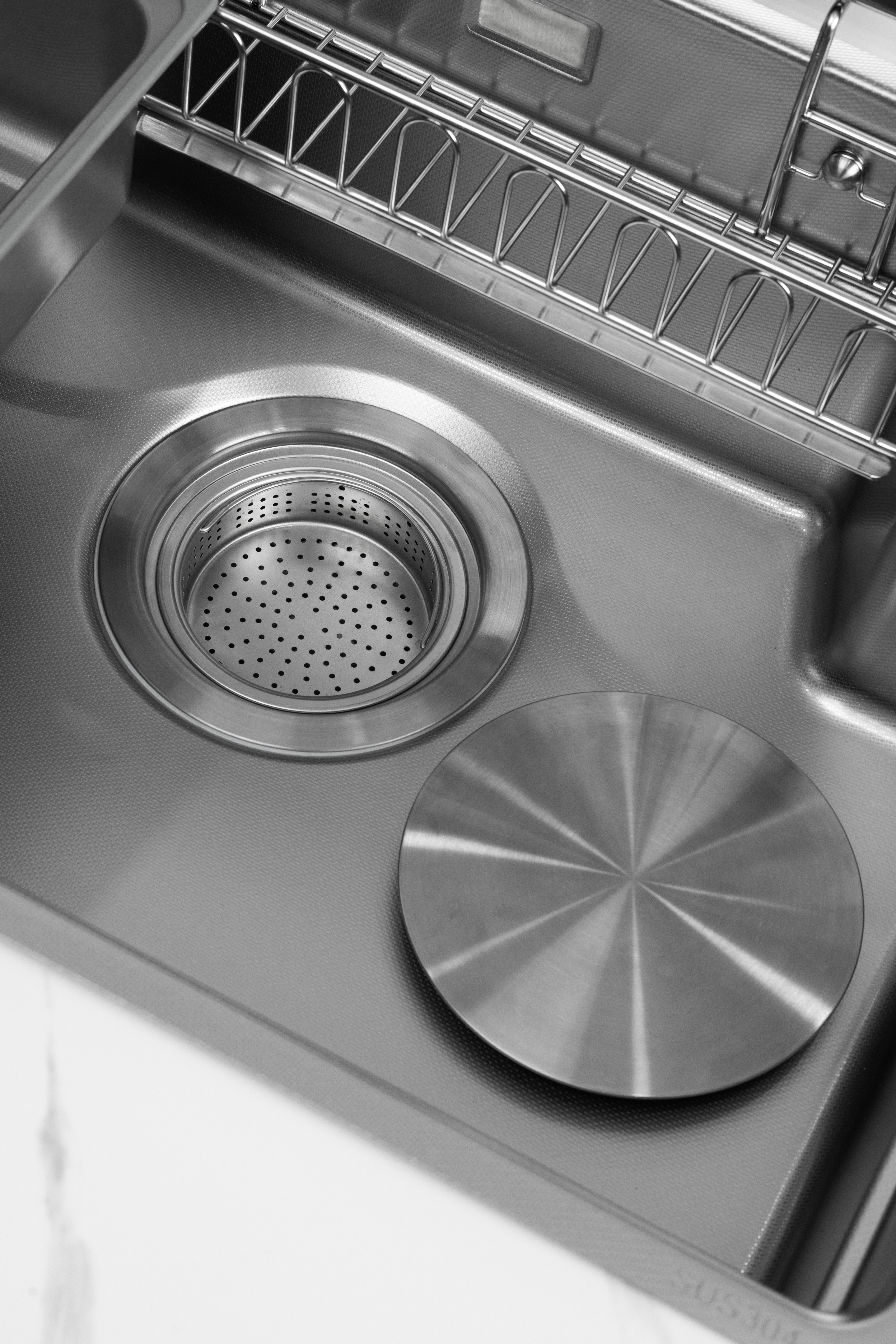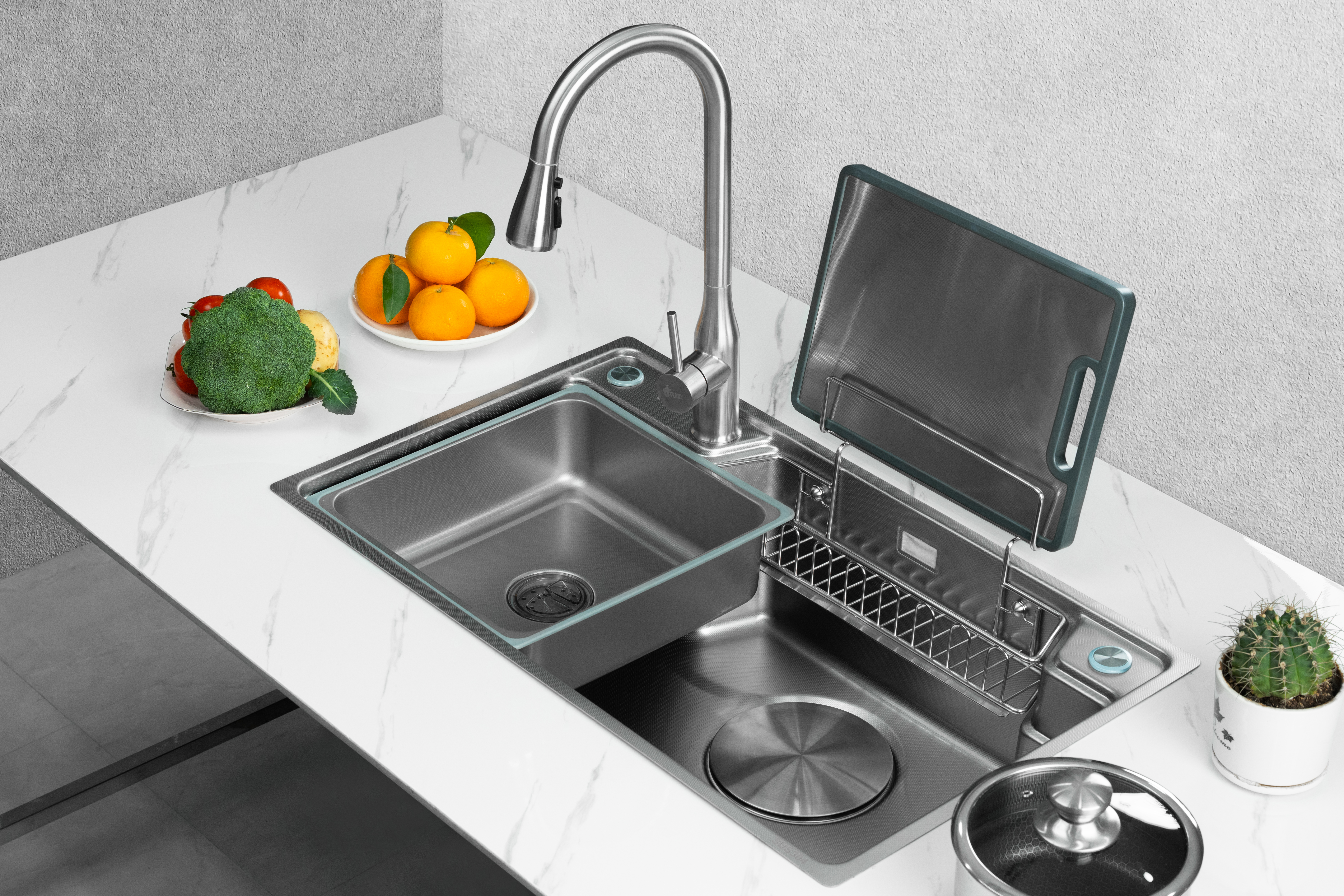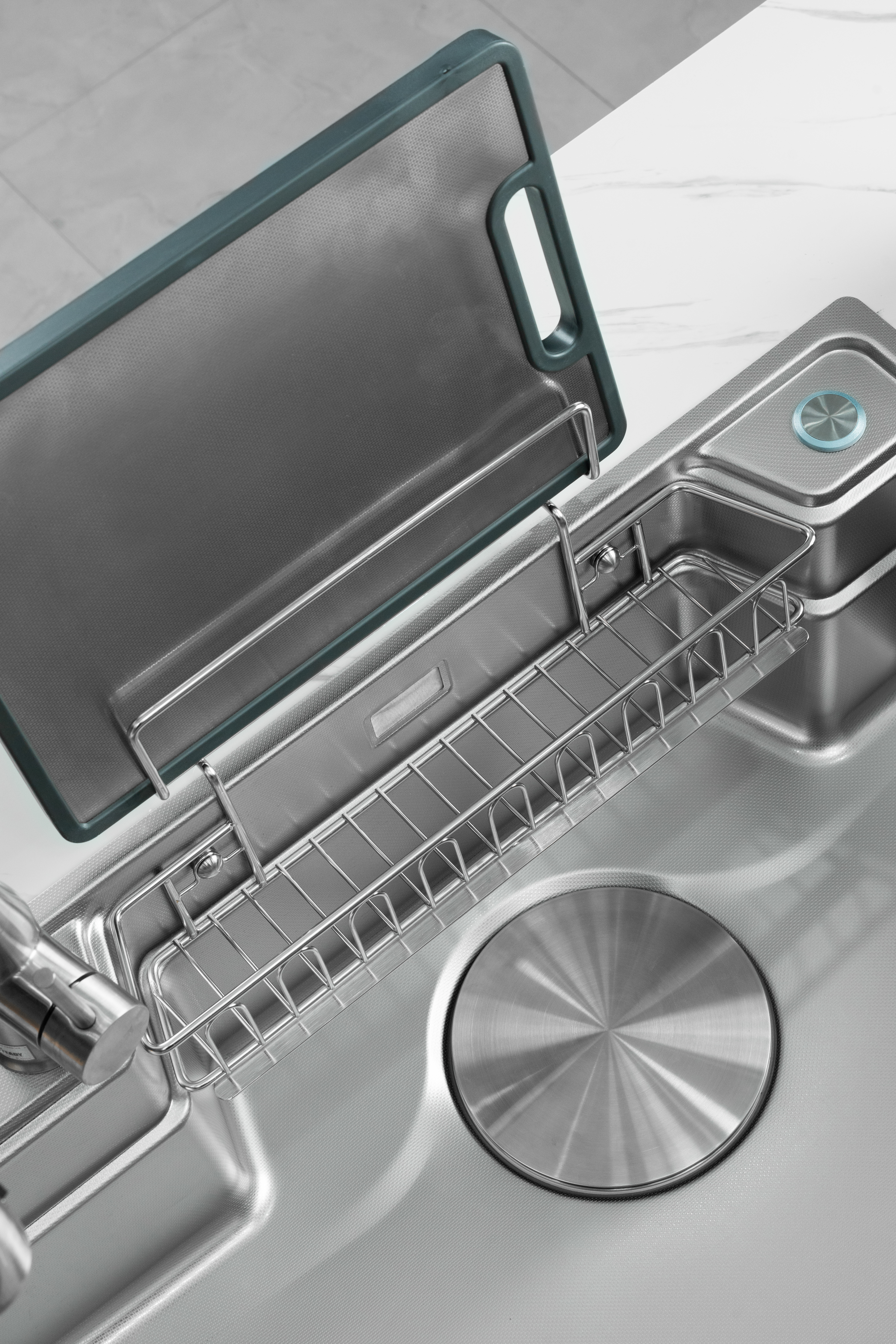 Phụ kiện đi kèm / Included accessories: 01 thớt thép không rỉ, 01 chậu phụ, 01 rổ thoát nước, 01 giỏ treo